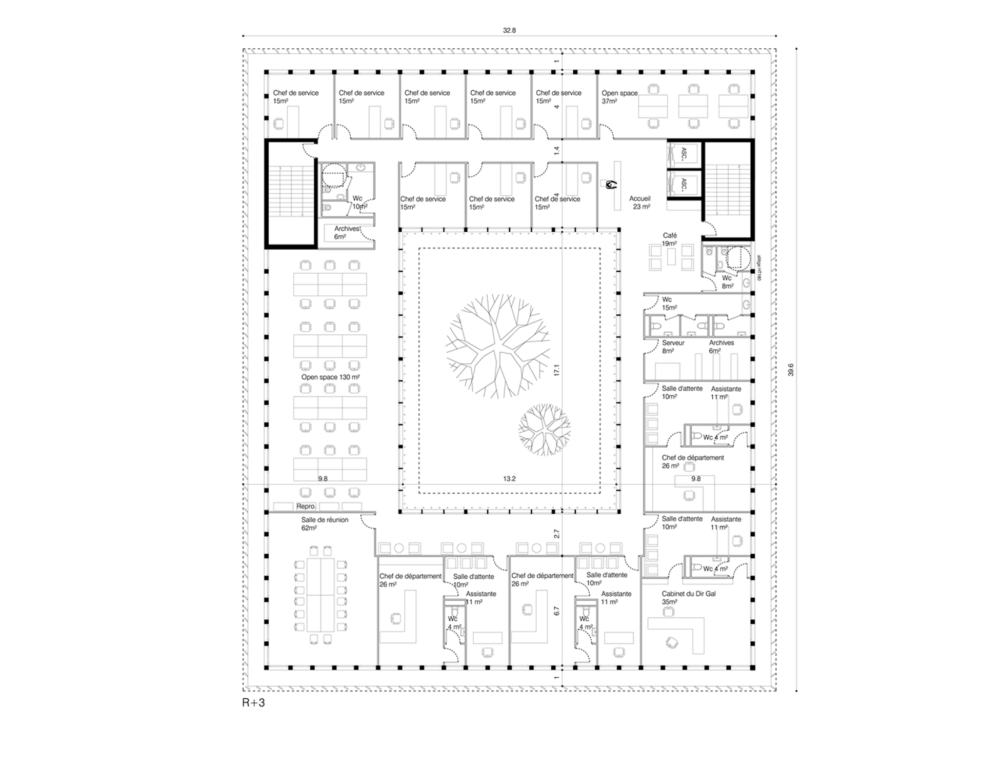 New administration building for the Campus of the University of Dakar. The Cheikh Anta Diop University was built for 6000 students, but hosts today 80 000 students. The campus is overpopulated and lack facilities as study rooms, cafés or other spaces for social activities. We designed office spaces elevated from the ground and organized around a patio. Protected by a planted buffer zone behind a second skin of vertical elements, from a cruelly heating sun and a buzzling street. The groundfloor becomes a part of the campus exterior space. In the shadow of the office levels this open space is given to the students for free use.